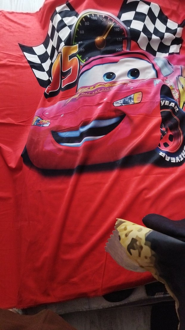 Renkli baskılı desenli, yumuşak sentetik kumaştan yapılmış canlı kırmızı çocuk örtü. Çocuklar için eğlenceli araba motifi içerir. lekesi olduğu için uygun fiyatlı