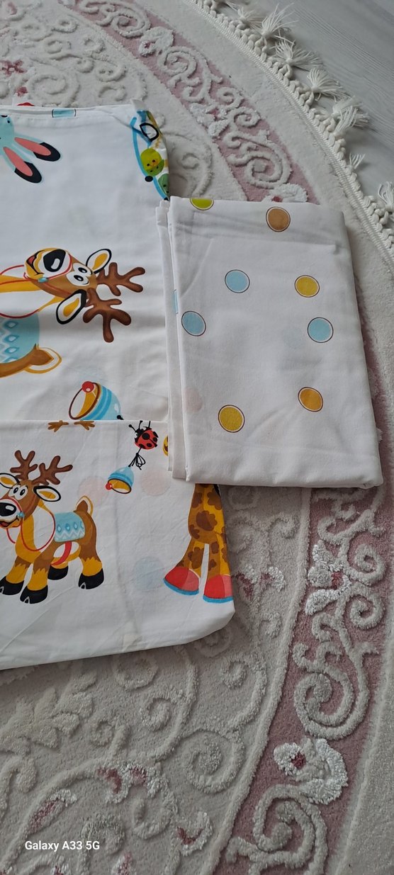 Renkli baskılı çizgi karakterler ve puantiyelerle süslenmiş, yumuşak sentetik kumaştan çocuk uyku seti. 1kez kullanildi cotton box ürünüdür 2 adet yastık nevresim ve carsaf