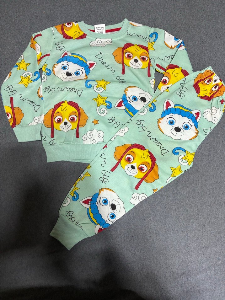 Renkli baskılı çizgi karakterlerle süslenmiş, yumuşak ve sıcak kumaştan çocuk pijama takımı.