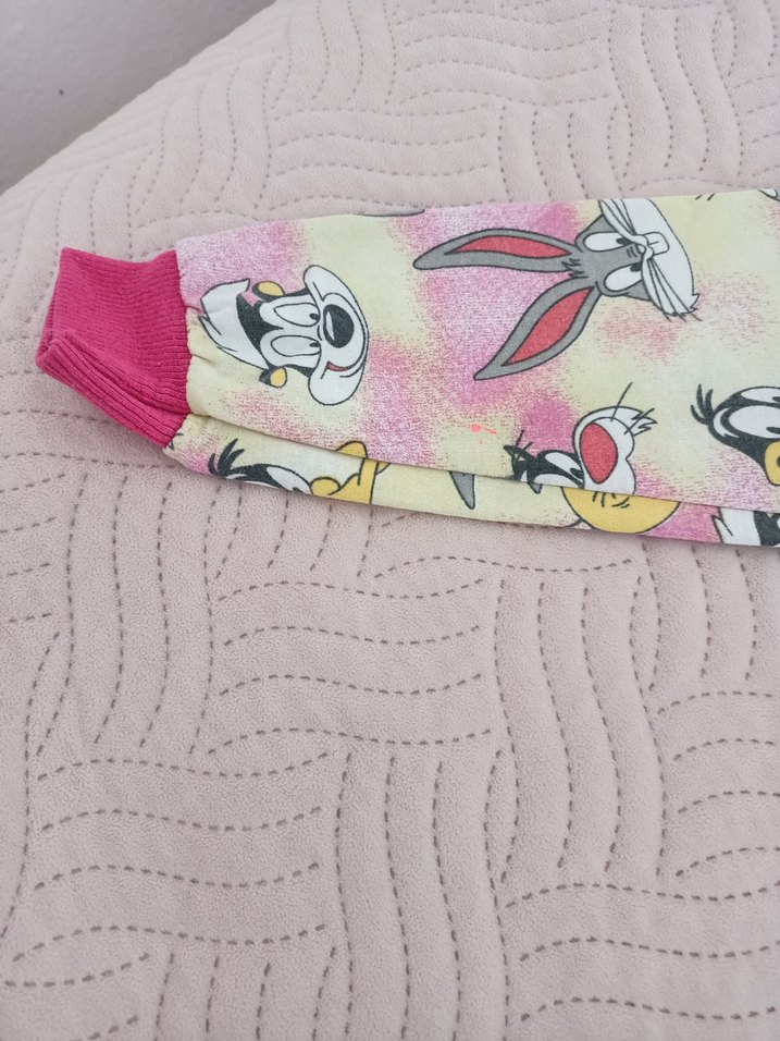 Sentetik kumaştan, pembe tonlarda renkli baskılı çocuk pijama kolu, yumuşak ve rahat uyku tekstili için uygundur. 2-3 yaş uygundur