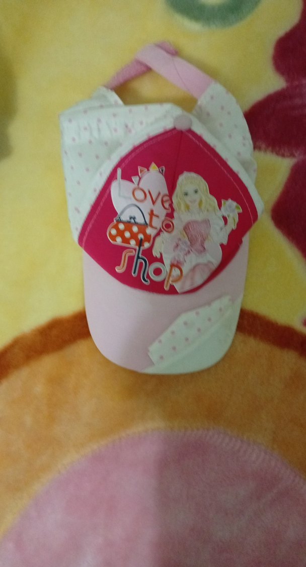 Renkli baskılı, pembe çocuk şapkasıdır. Plastik malzemeden yapılmış olup ayarlanabilir Velcro bant içerir. Retro tarzda ve 'Sho' yazısı görünür.