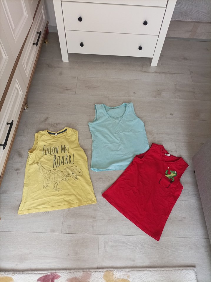 Renkli baskılı çocuk atletleri, sarı dinozor desenli, açık mavi sade ve kırmızı küçük baskılı modellerle rahat kullanım sağlar.