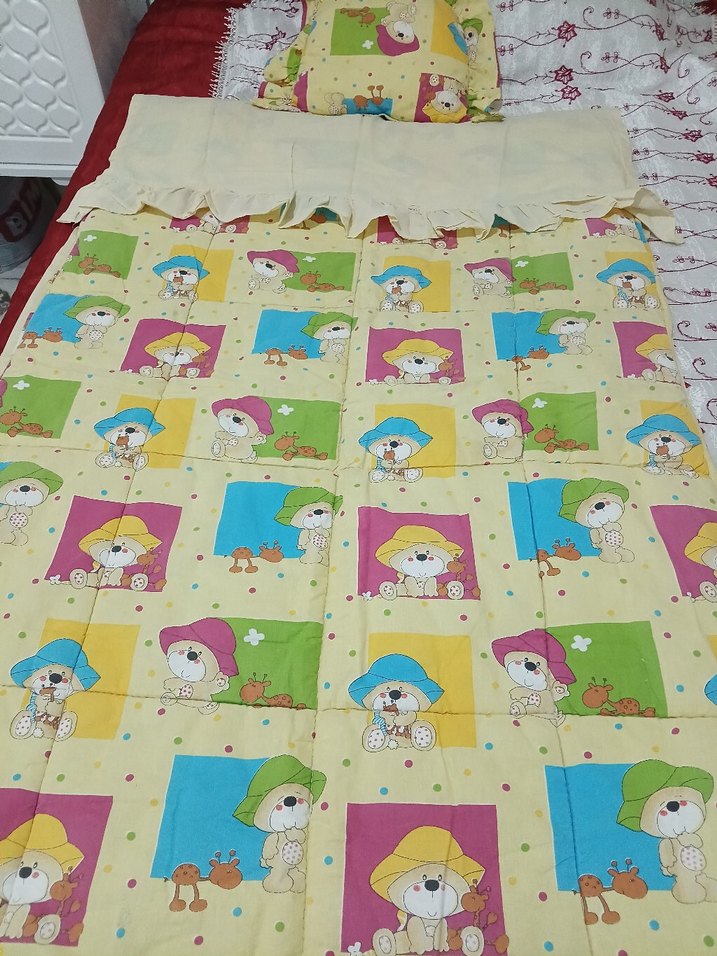 Sentetik kumaştan yapılmış, renkli baskılı çocuk uyku tekstili, rahat uyku için idealdir.