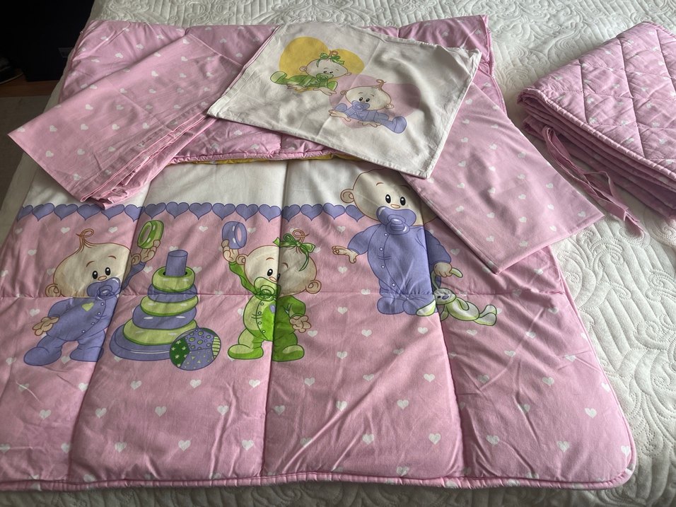 Set halindedir. Çarşaf,2 adet yastık kılıfı,beşik kenarı korumalığı yorganı ve yarım yorgan kılıfı. Yorgan kılıfının ve yastık kılıfının birinde çıkaramadığım lekesi vardır o yüzden fiyatı uygun tuttum yorganı yıkanabilir elyaf yorgandır. Taç Kristal markadır