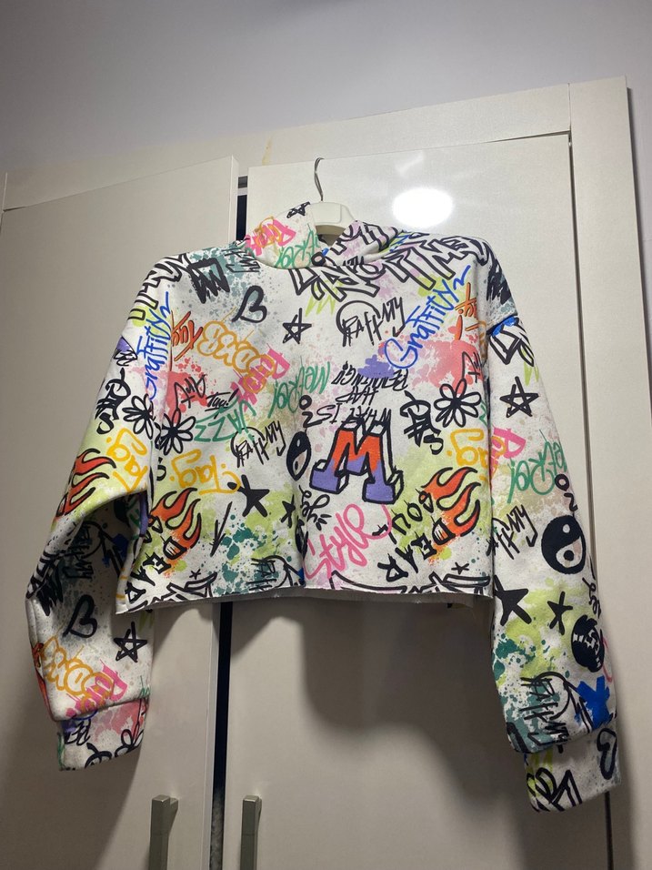 Renkli baskılı desenlere sahip, uzun kollu ve yuvarlak yakalı bol kesim crop sweatshirt.