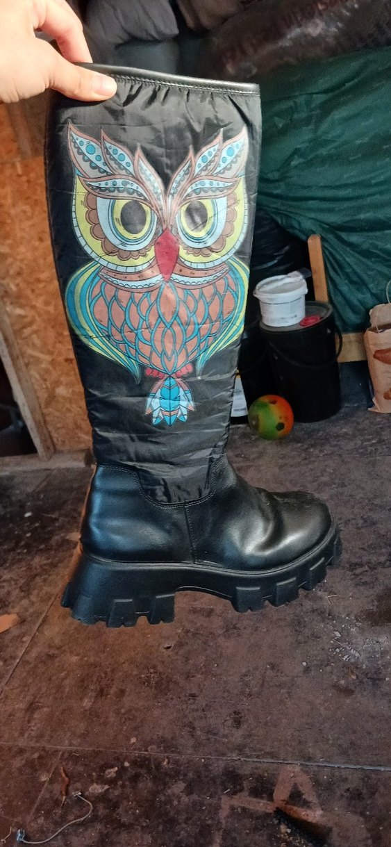 Koyu renkli çok renkli baskılı baykuş desenli deri diz üstü çizme, platform topuklu ve tokalı detaylı, sokak stili için uygun.