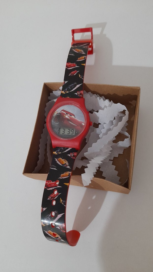 Renkli baskılı kayışa ve kırmızı plastik tokaya sahip dijital çocuk saati. şimşek mcqueen Ürünü hediye aldım ama veremedim hiç kullanılmadı lisanslı ürün jelatini üstünde
