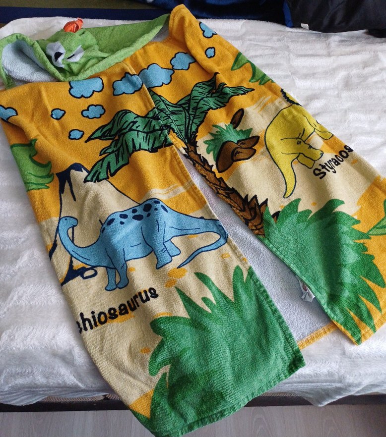 Renkli baskılı dinozor desenlerine sahip çocuk bornozu, yumuşak ve emici kumaştan üretilmiştir. kapayi kapatan şekildedir.