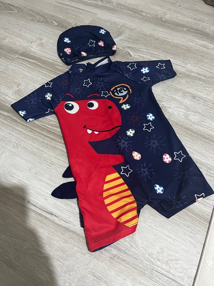 Mavi zemin üzerine renkli baskılı dinozor desenli kısa kollu erkek bebek mayo ve uyumlu yüzme bonesi içerir. Ürün yeni 1 kere giyildi 5/6 yaş