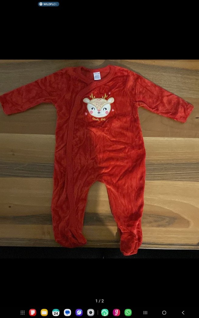 Kırmızı renkli, baskılı ve düğmeli bebek kız tulumu. Yumuşak kumaş defo yırtık yok 1 kez yılbaşında giydi sadece