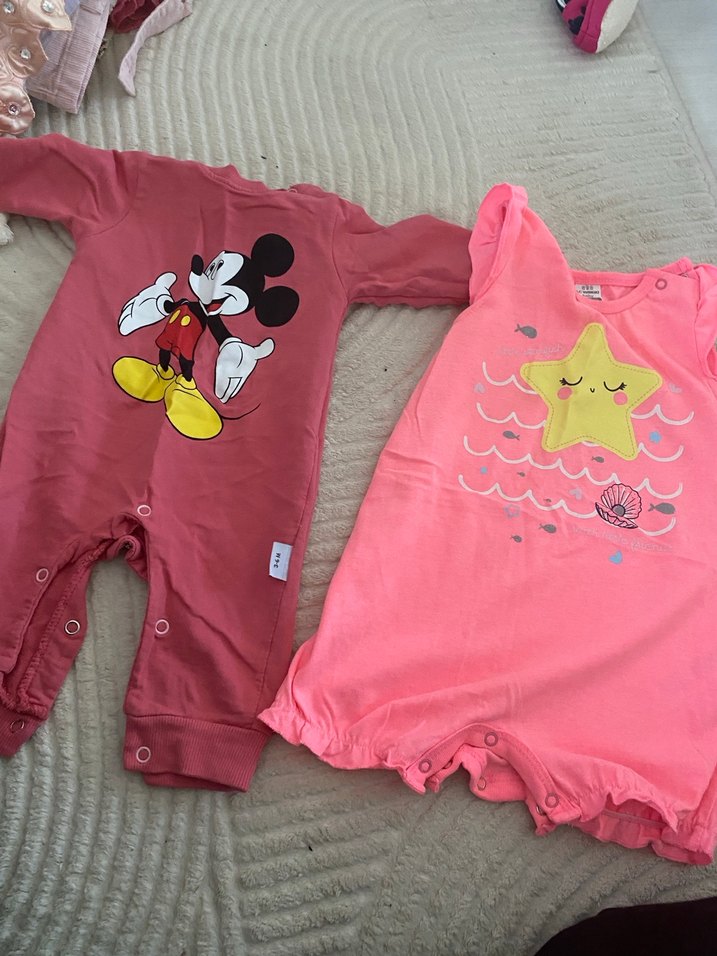 Düğmeli, renkli baskılı bebek kız tulumları. Biri Mickey Mouse, diğeri deniz yıldızı desenli. Rahat ve eğlenceli.