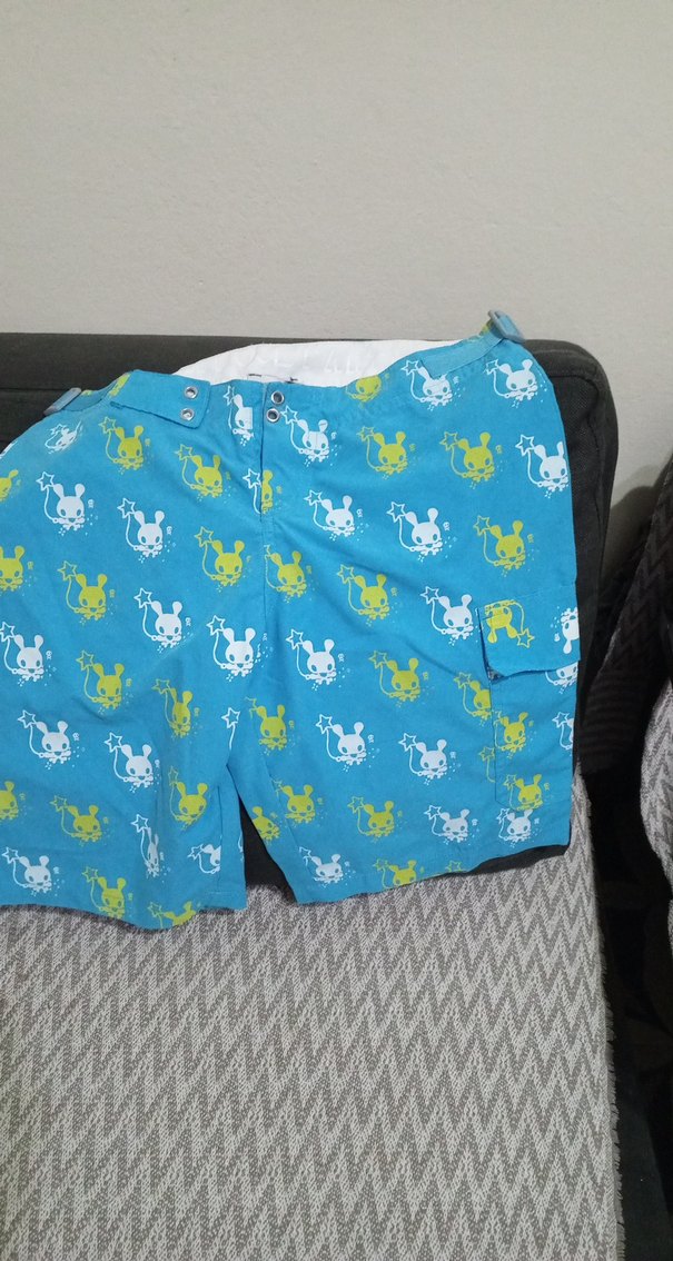 Renkli baskılı, düğmeli ve bol kesim mavi erkek mayo. Normal midi boyunda, rahat ve sokak stilinde plaj kullanımı için uygun.