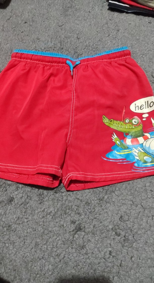 Sentetik kumaştan, düğmeli, renkli baskılı kırmızı erkek şort. Rahat kesimiyle günlük kullanıma uygundur.