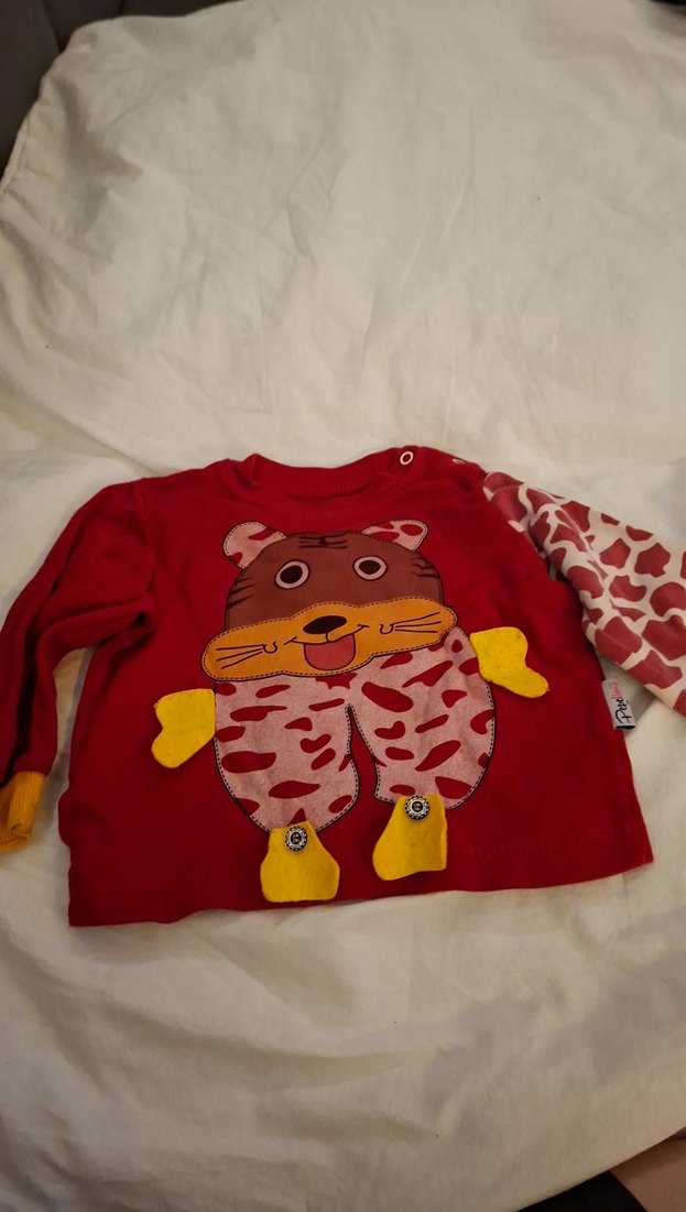 Renkli baskılı, düğmeli kırmızı kedi kıyafeti. Sokak tarzı, eğlenceli detaylar ve farklı desenli kollar içerir.