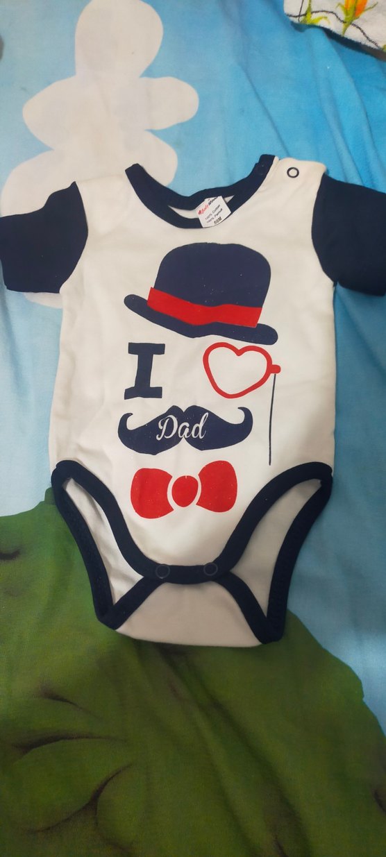 Kısa kollu, pamuklu, renkli baskılı, yuvarlak yaka ve çıtçıtlı erkek bebek body. 'I ❤️ Dad' desenli.