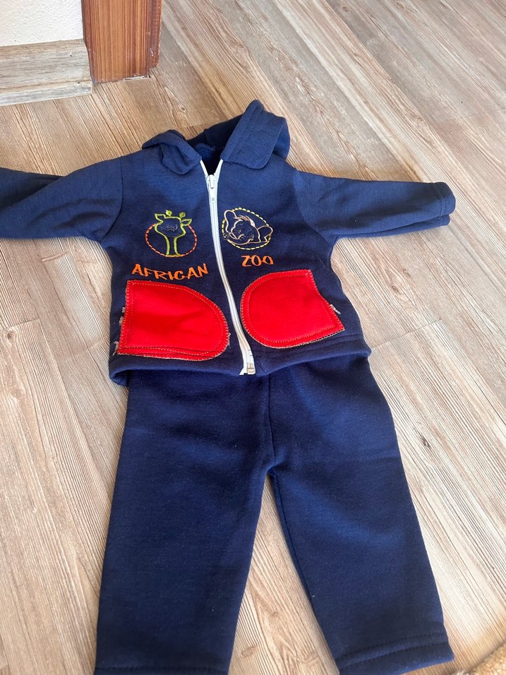 Fermuarlı, uzun kollu ve yakalı, yumuşak ve sıcak kumaştan yapılmış renkli baskılı erkek bebek eşofman takımı. Kırmızı ceplerle detaylandırılmış.