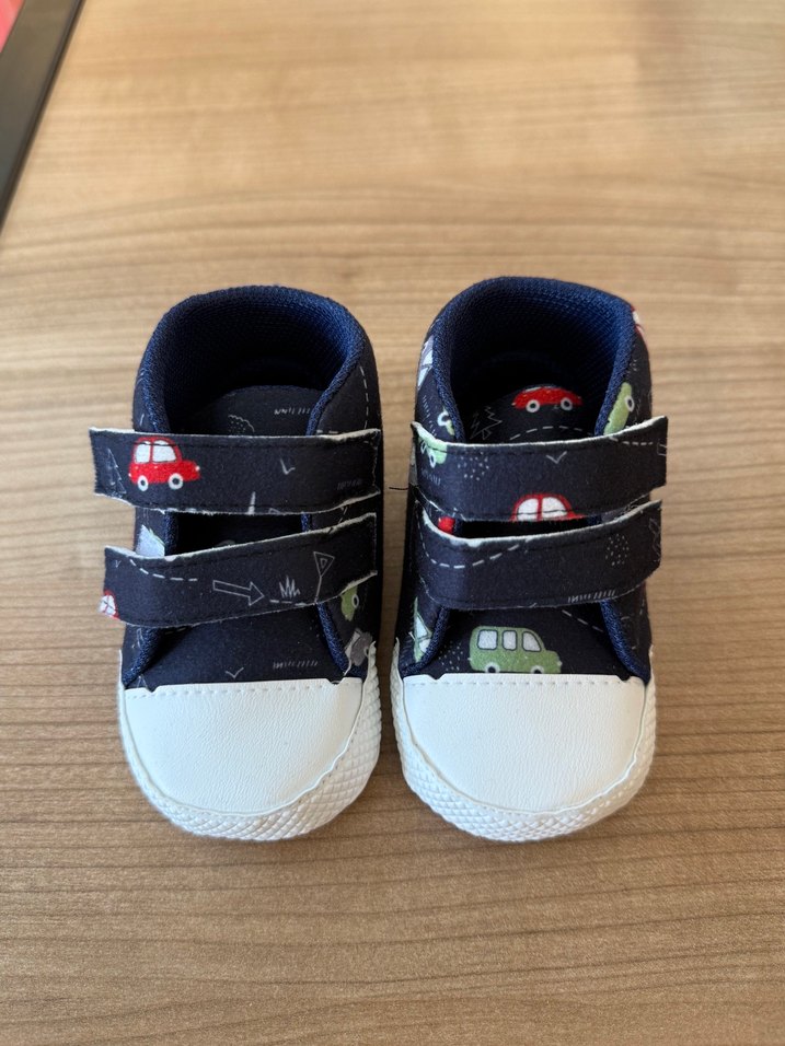 Renkli baskılı desenlere sahip, cırt cırtlı erkek bebek ilk adım ayakkabısı. Kauçuk tabanlı, trend sokak stili için uygun.