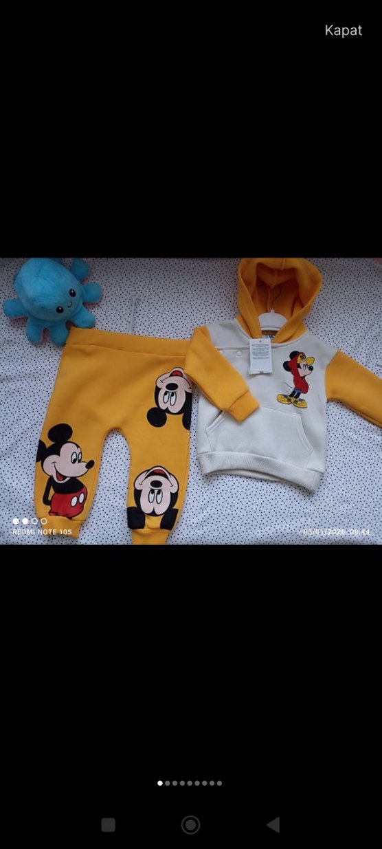 Renkli baskılı, uzun kollu ve kapüşonlu erkek bebek takımı. Yumuşak, örme tüylü kumaştan üretilmiş olup, sıcak ve rahat bir kullanım sunar. Canlı sarı renkli. polar kumaş tan