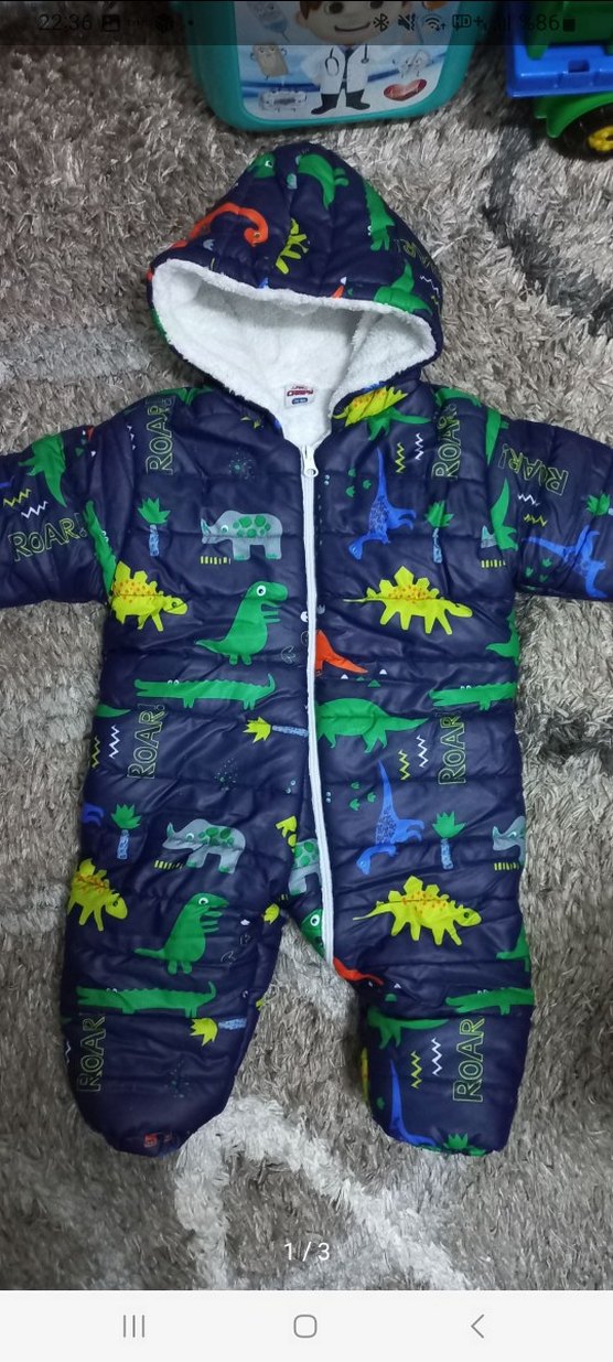 Renkli dinozor desenli erkek bebek kış tulumu, kürklü kapüşon ve yumuşak polar iç yüzeye sahiptir.