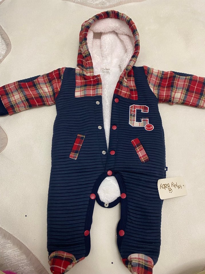 Renkli baskılı, yumuşak sıcak tutan erkek bebek tulumu. Lacivert taban, kırmızı ekose kollar ve kapüşonlu sokak stili tulum.