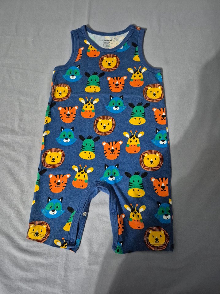 Kolsuz, renkli hayvan baskılı bebek tulumu. Yumuşak ve sıcak örme kumaştan, yuvarlak yaka ve kolay giydirme için bacaklarda çıtçıtlı.