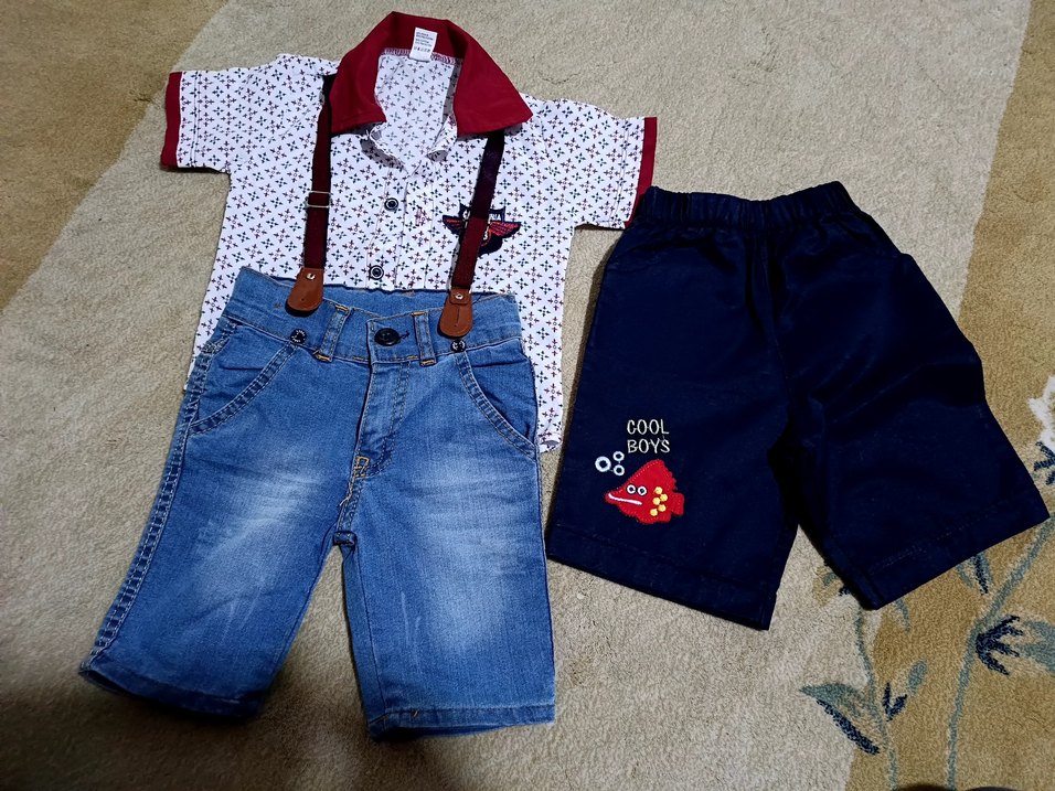 Renkli baskılı kısa kollu gömlek, yakalı ve tokalı askılı kot şort ile 'COOL BOYS' nakışlı koyu şorttan oluşan erkek bebek takımı. aklınıza takılanı sorun lütfen