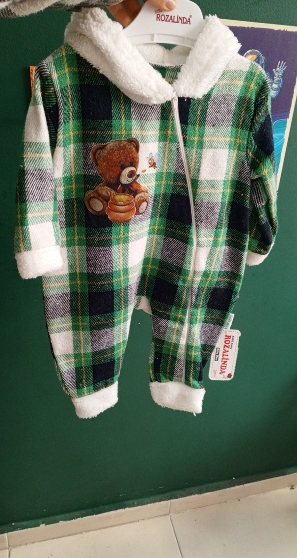 Yumuşak ve sıcak kumaştan yapılmış, örme detaylı, baskılı ayıcık desenli renkli yeşil erkek bebek tulumu. 1 yaş bebe kullanabilir 49 cm boy / 30 cm en