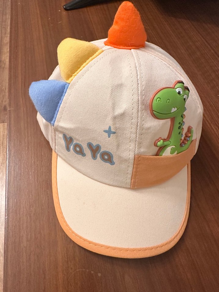 Yumuşak sentetik kumaştan yapılmış, renkli baskılı ve Velcro kapamalı erkek çocuk şapkası. Dinozor desenli ve 'YaYa' yazılıdır. Yeni hiç kullanılmadı