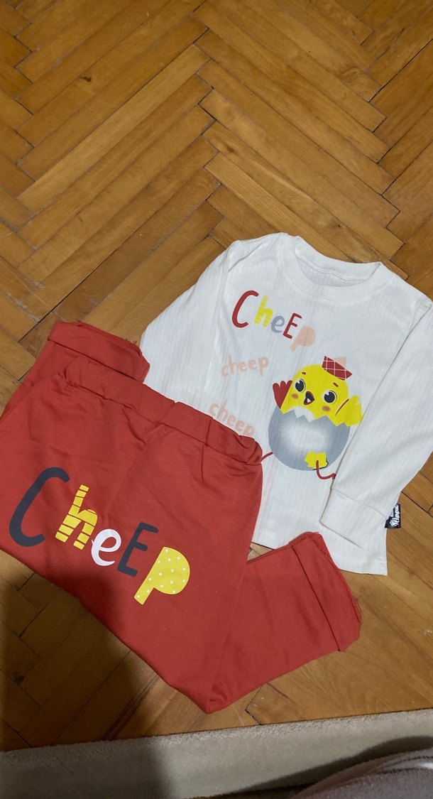 Renkli baskılı civciv figürlü, uzun kollu bisiklet yaka üst ve kırmızı örme pantolonlu yumuşak ve sıcak kumaştan erkek bebek takımı.