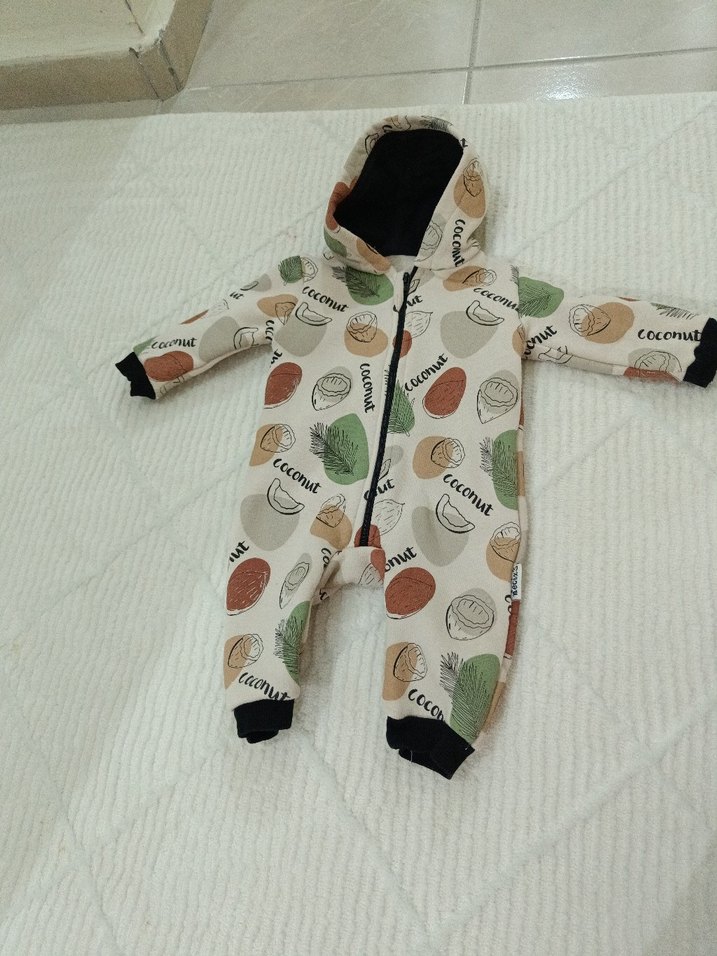 Renkli baskılı, örgü kapüşonlu erkek bebek tulumu, yumuşak ve sıcak fleece kumaştan üretilmiştir. Önden fermuarlıdır ve siyah manşetleri vardır.