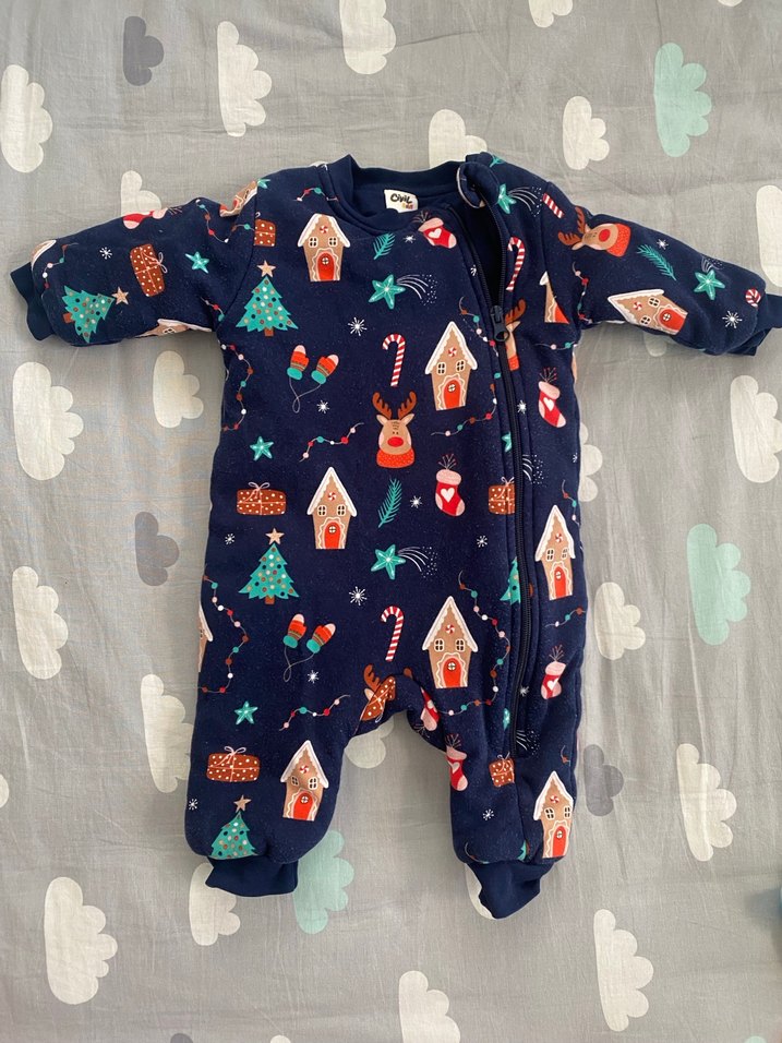 Renkli baskılı, uzun kollu, yüksek yakalı ve triko dokulu erkek bebek tulumu. Yumuşak ve sıcak kumaştan yapılmıştır, mavi tonlarda desenlidir.
