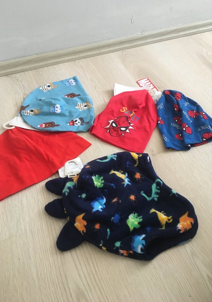 Yumuşak, örgü polar kumaştan yapılmış renkli baskılı erkek bereleri ve boyunluklar. Dinozor ve süper kahraman desenleriyle sokak tarzı aksesuarlar. Verilen fiyat 2 Li bere için dir