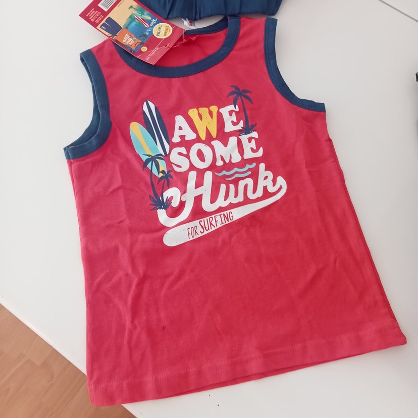 Renkli baskılı, kolsuz ve bol kesim erkek çocuk tişörtü, pamuklu yumuşak kumaştan, bisiklet yaka ve sörf temalı desenlerle süslenmiştir.