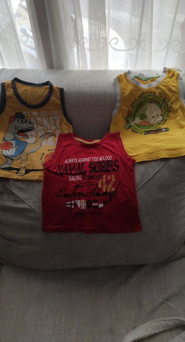 Renkli baskılı, askısız erkek çocuk tişörtleri, fitted kesimi ve rahat tarzıyla dikkat çekiyor. Üzerlerinde 'SAILINGO' ve 'ALAYSAGANSDEFLOOD' yazılı deniz temalı baskılar bulunur. ⛵