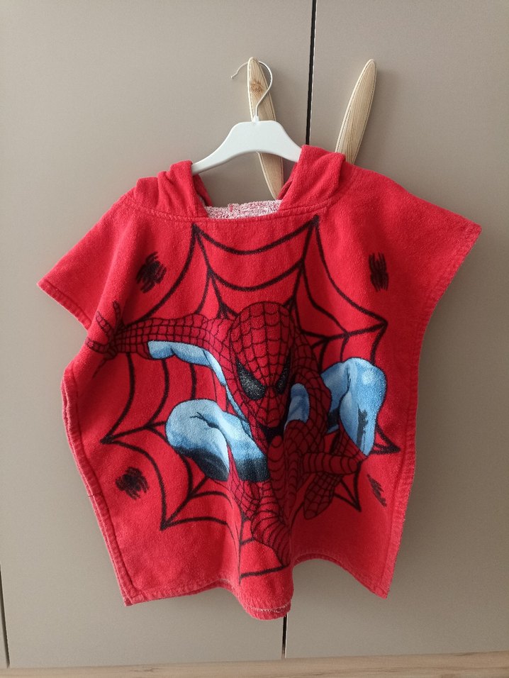 Kapüşonlu, yumuşak kırmızı kumaştan, renkli baskılı Spiderman desenli erkek çocuk bornozu. Banyo sonrası kullanıma uygundur. fotolarda gösterdim iki yerinde küçük delik var kullanıma engel değil. 3 yaştan heryasa kadar kullanılabilir