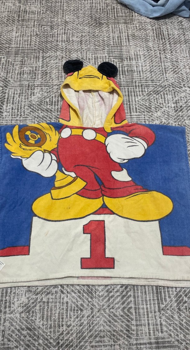 Renkli baskılı ve kulaklı kapüşonlu erkek çocuk bornozu, yumuşak ve rahat kumaştan yapılmıştır.