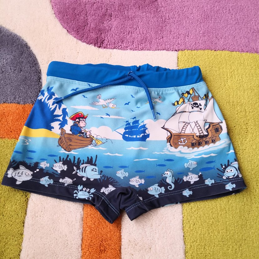 Renkli korsan ve deniz yaşamı baskılı, mavi bel bantlı ve bağcıklı erkek çocuk deniz şortu. Kısa tarzda. #erkek #erkekçocuk #mayo #şort