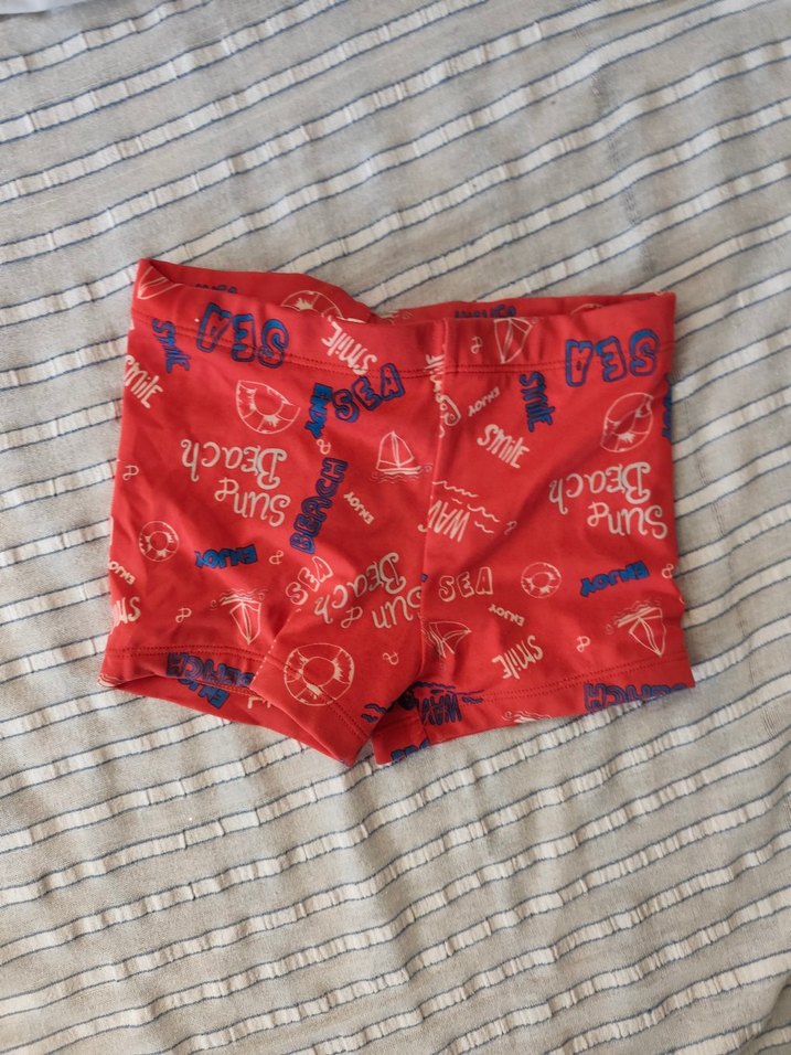 Kısa kollu, deniz ve güneş temalı renkli baskılı kırmızı erkek çocuk deniz şortu.
