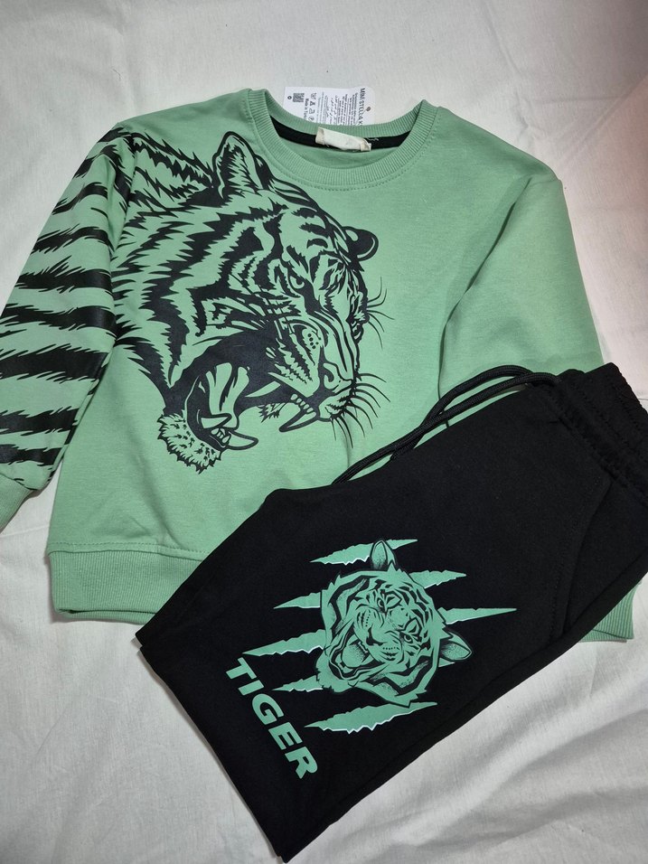 Rahat kesim, bisiklet yaka sweatshirt ve baskılı kaplan desenli eşofman altından oluşan renkli erkek çocuk sokak giyim takımı.