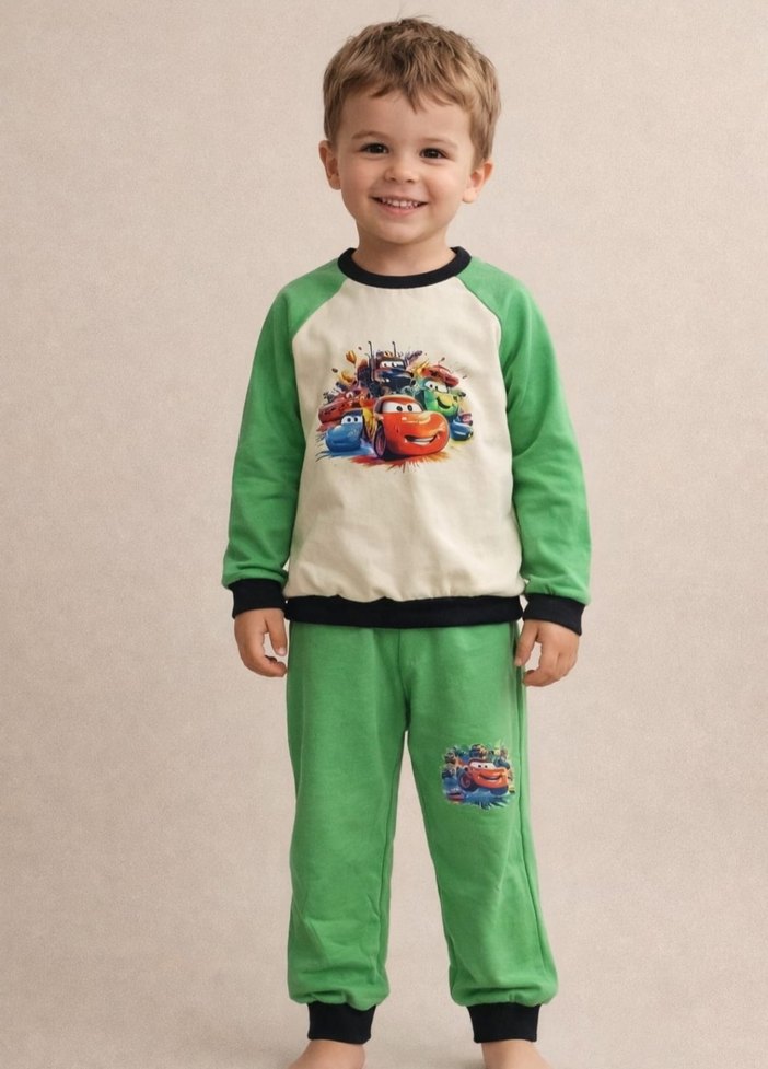 Rahat kesim, bisiklet yaka sweatshirt ve altından oluşan, yumuşak örme kumaştan yapılmış renkli baskılı erkek çocuk eşofman takımı.