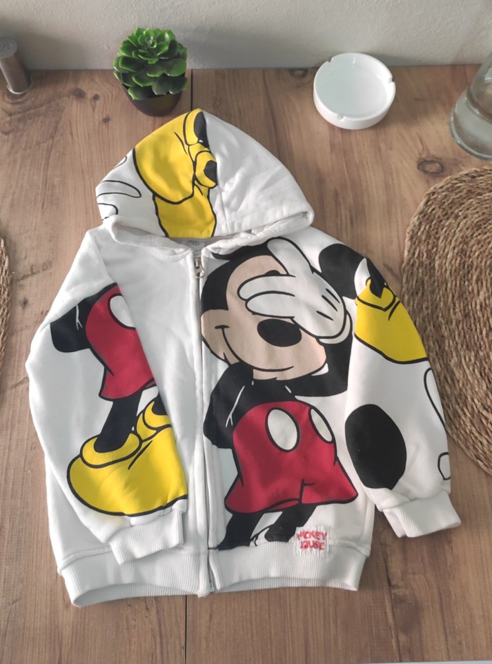 Rahat kesim, kapüşonlu ve fermuarlı erkek çocuk ceketi, yumuşak ve sıcak kumaştan, renkli Mickey Mouse baskılarıyla sokak stiline uygun.