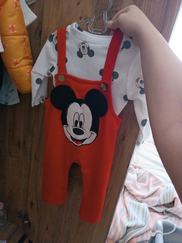 Düğmeli, pamuklu ve bol kesim kırmızı tulum, önünde renkli Mickey Mouse baskısı bulunur, kolsuz baskılı tişört ile tamamlanır.