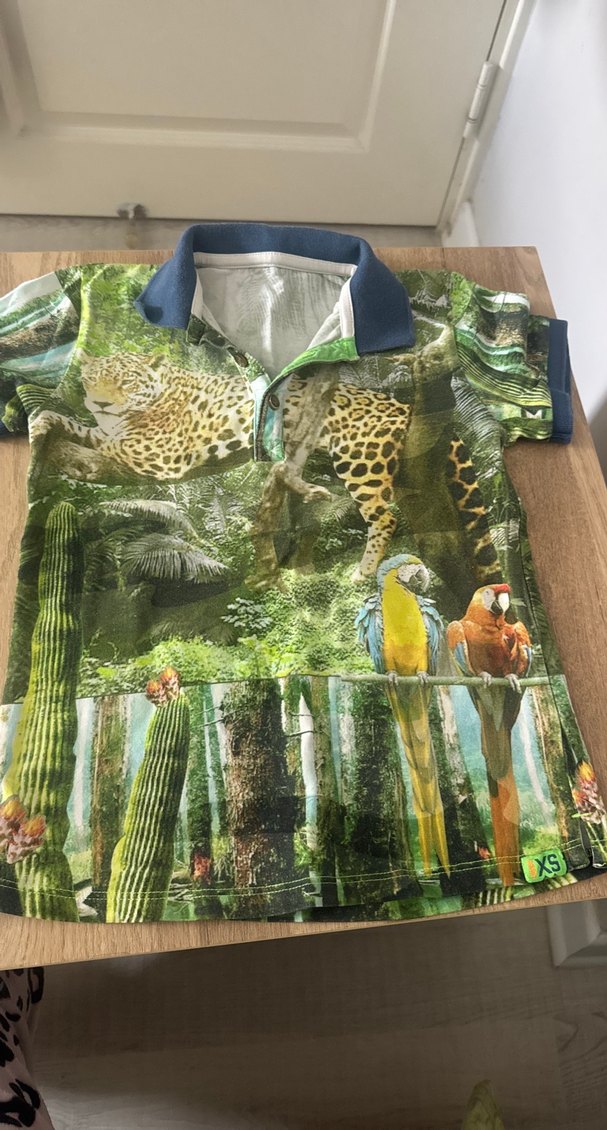 Renkli baskılı, tropikal hayvan ve bitki desenli erkek çocuk gömleği. Sentetik kumaştan, kısa kollu, yakalı ve bol kesimdir. Sokak modası için uygun.