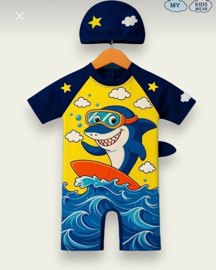Kısa kollu, renkli baskılı erkek çocuk mayo, köpekbalığı, dalgalar, yıldızlar ve bulutlar desenli. Uyumlu şapka dahil.