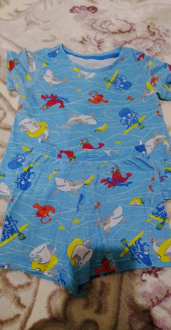 Renkli baskılı, mavi renkli, kısa kollu ve bisiklet yaka erkek çocuk pijama takımıdır. Rahat kesimli, yumuşak örme kumaştan üretilmiştir.