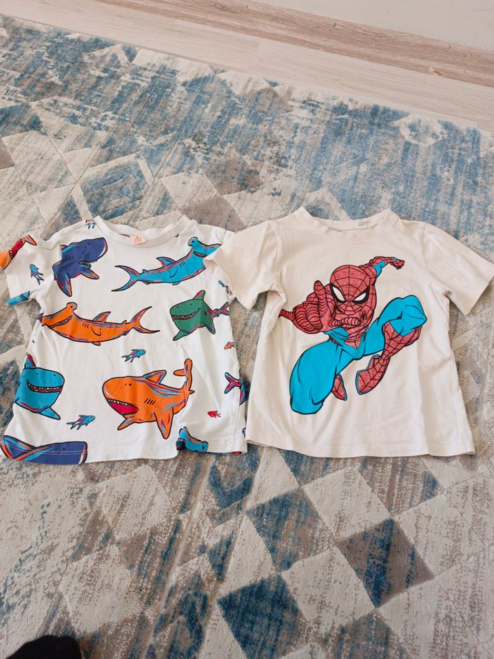 Pamuklu kumaştan yapılmış, baskılı köpekbalığı ve Örümcek Adam desenleriyle renkli, kısa kollu ve dar kesim erkek çocuk tişörtleri. ️