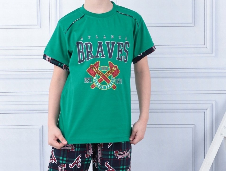 Rahat kesim, kısa kollu erkek çocuk tişörtü, yeşil renkte ve renkli Atlanta Braves baskılı. Bisiklet yaka ve kemerli detaylı.
