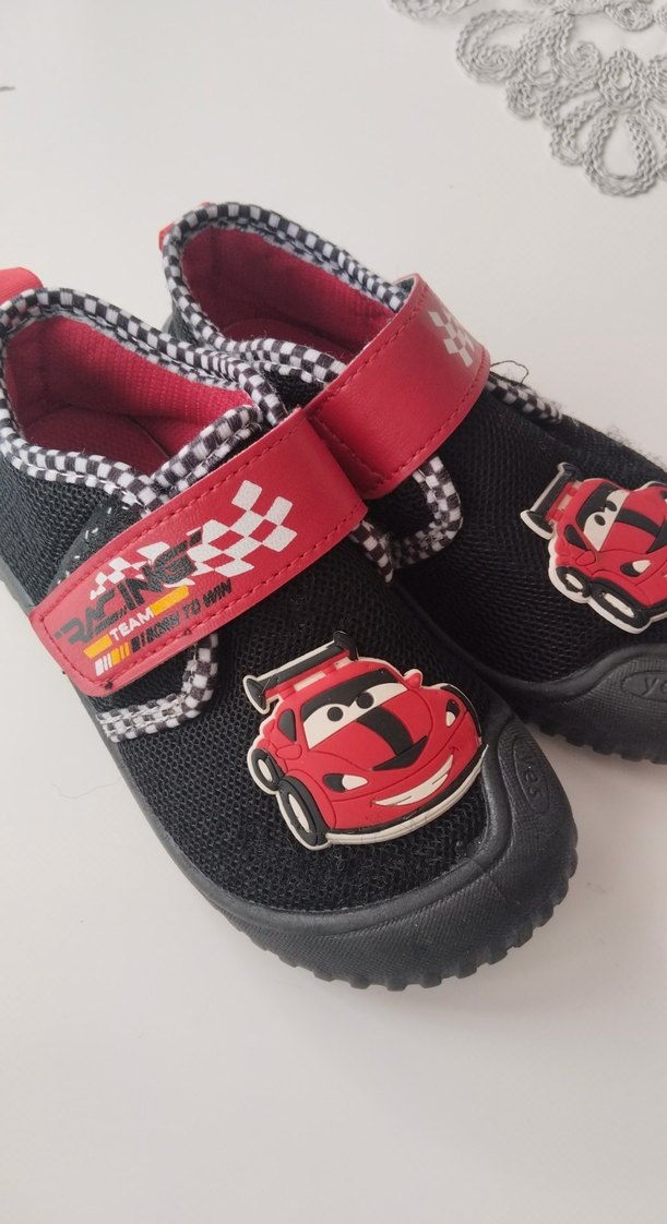 Renkli baskılı, kreş çocuk ayakkabisi. Kauçuk malzemeden, kırmızı siyah renklerde ve biker tarzındadır. kaymaz taban . 27 numara yırtık sökük yok . yeni gibi ama cirtlari tutmuyor.