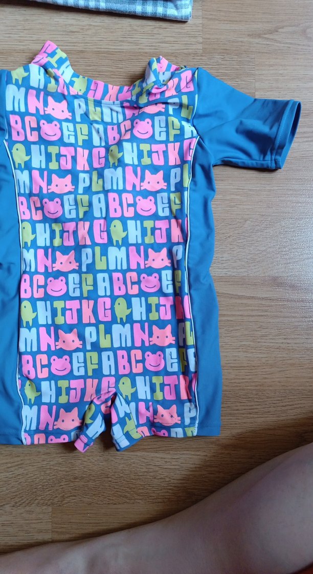 Erkek çocuk mayo, kısa kollu ve mavi renkte, ön kısmında renkli hayvan ve harf desenleri bulunur.
