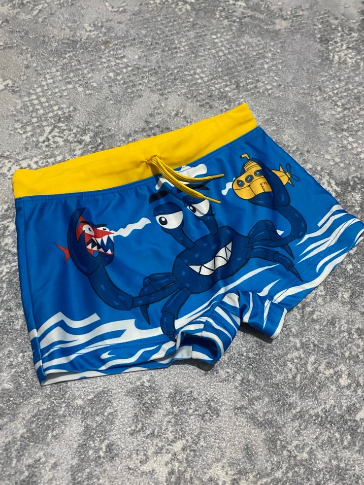 Renkli baskılı, sarı bel bantlı ve mavi tabanlı erkek çocuk mayo, deniz canlıları desenlidir. Yaz eğlencesi için uygundur .